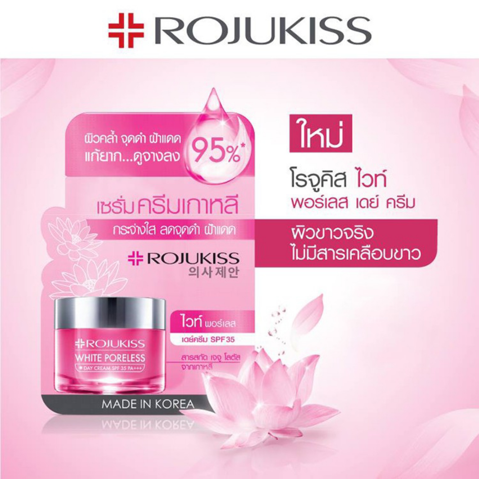หากเพื่อนๆกำลังมองหา เซรั่มเกาหลี Rojukiss สีชมพู ที่มีคุณสรรพคุณช่วยเรื่องความกระจ่างใส ลดจุดด่างดำต่างๆ ต้องนึกถึง Rojukiss White Poreless Day Cream เป็นอย่างแรกเลยค่ะ Rojukiss White Poreless Serum นั้นสามารถแก้ปัญหาสีผิวไม่สม่ำเสมอฝ้าแดดได้เป็นอย่างดีเลยนะคะ